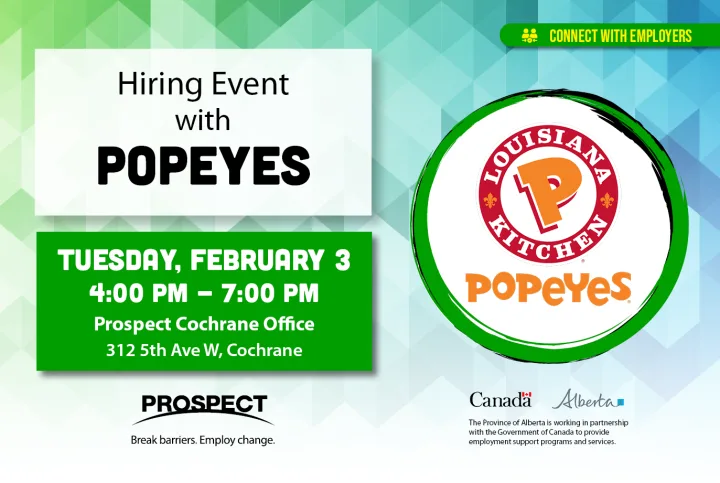 Join us for an in person hiring event with Popeyes Cochrane on February 3 from 4 to 7 pm. Popeyes is currently hiring for multiple part time and full time cooks and food service attendants. This is a great opportunity for job seekers who want to start working right away in a fast paced food service environment.
